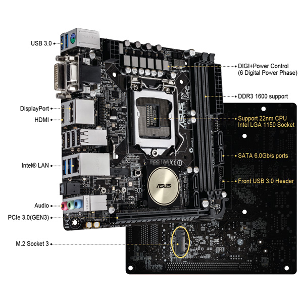 ASUS H97I-PLUS mini-ITX - LGA1150 / CPU Intel Core i3/i5/i7 compatible, mini-ITX motherboard - front view ASUS H97I-PLUS mini-ITX - LGA1150 / CPU Intel Core i3/i5/i7 compatible, mini-ITX motherboard - I/O connectors view ASUS H97I-PLUS mini-ITX - LGA1150 / CPU Intel Core i3/i5/i7 compatible, mini-ITX motherboard - angle view ASUS H97I-PLUS mini-ITX - LGA1150 / CPU Intel Core i3/i5/i7 compatible, mini-ITX motherboard - 1x M.2 Socket (M KEY) view