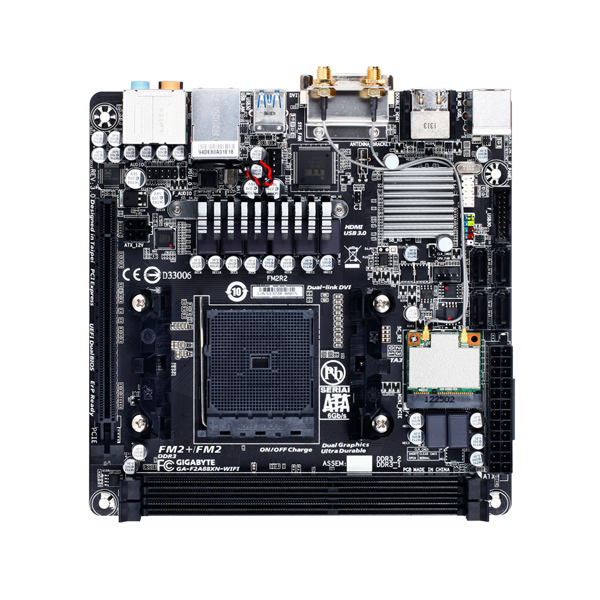GIGABYTE GA-F2A88XN-WIFI mini-ITX motherboard with Socket FM2+ supports AMD FM2+/FM2 A-series APU - top view GIGABYTE GA-F2A88XN-WIFI mini-ITX motherboard with Socket FM2+ supports AMD FM2+/FM2 A-series APU - I/O connectors view GIGABYTE GA-F2A88XN-WIFI mini-ITX motherboard with Socket FM2+ supports AMD FM2+/FM2 A-series APU - angle view